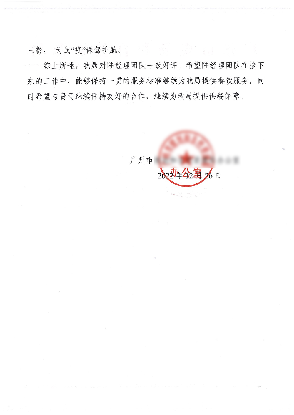 12月26日,來自某機關單位職工食堂后勤服務部的信函中表揚道,在工作量大幅度增加時,“貴司全體駐店員工團結一致,不畏困難、服從安排、努力工作,不斷提升服務質量和服務水平,使我院職工食堂深受廣大員工的喜愛,同時也獲得我院領導干部的好評”。
