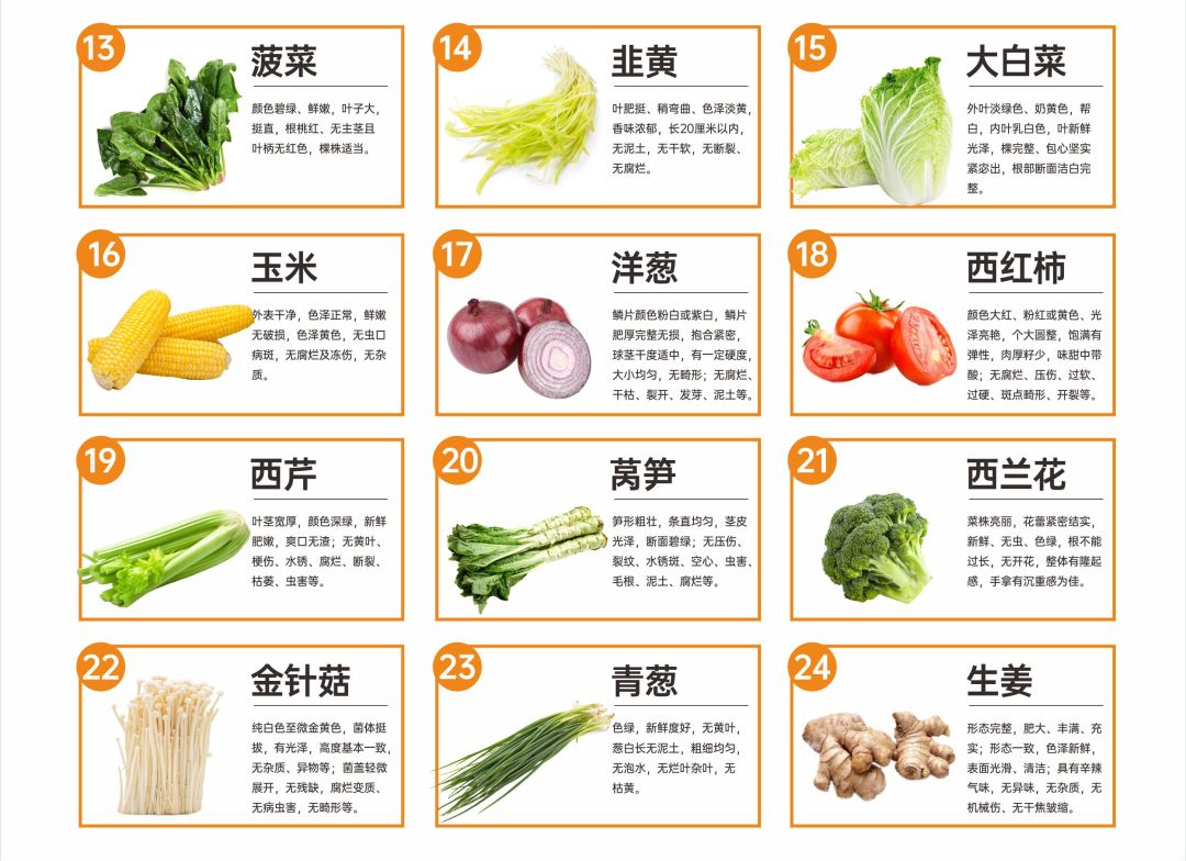 (1)新鮮程度:蔬菜應(yīng)顏色鮮艷、質(zhì)地飽滿,無腐爛、異味。